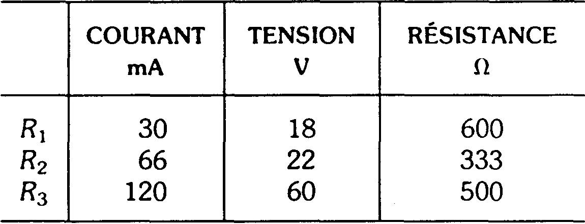 Le courant I3 à travers R3 est donc de 54 mA + 36 mA + 30 mA=120 mA. Ces valeurs I1, I2 et I3 apparaissent au tableau 6-1.