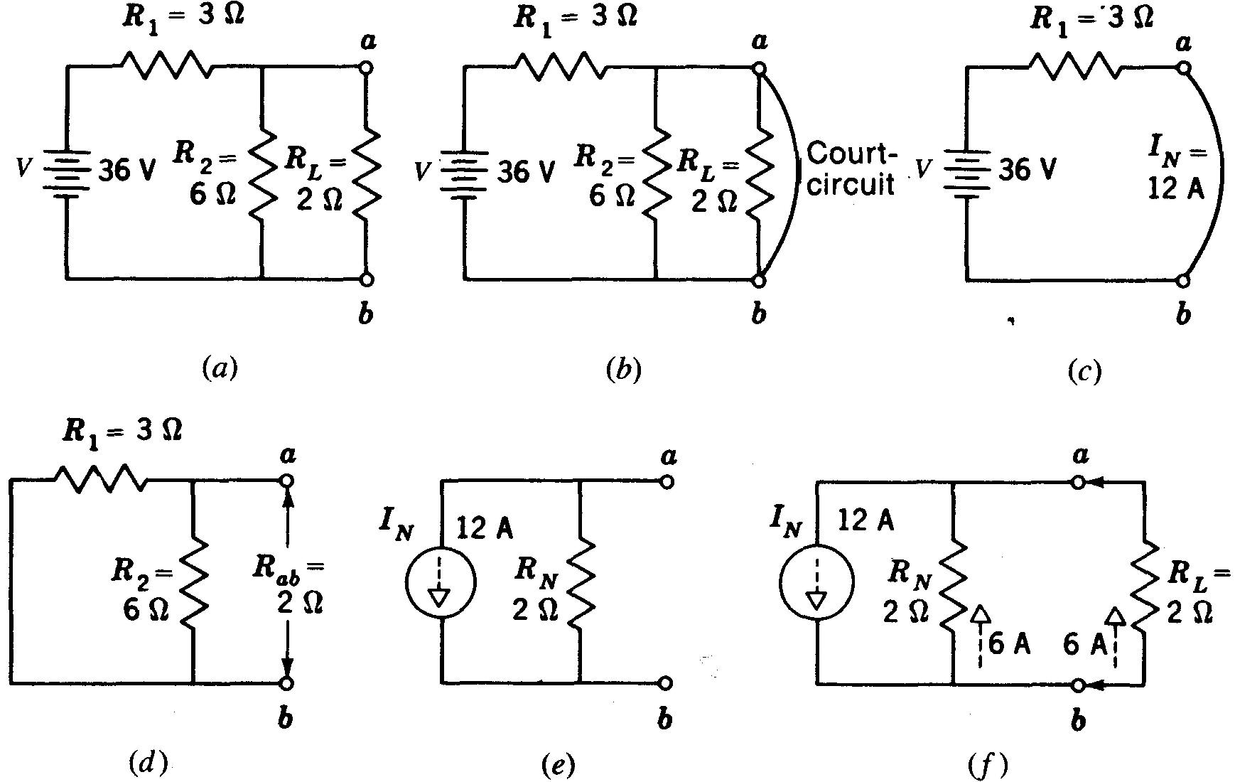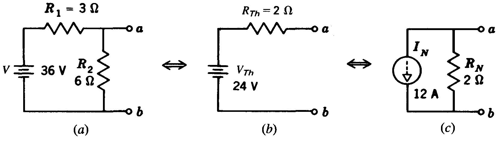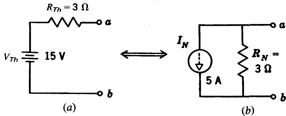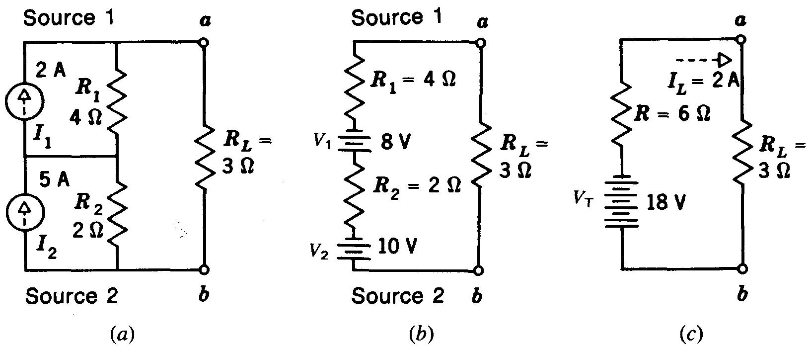Figure 9-13 La source de tension en (a) correspond à la source de courant en (b).