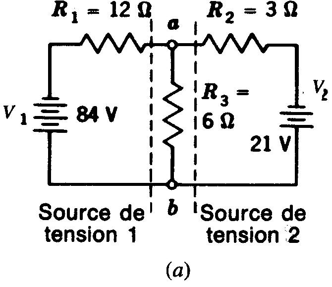 On remarque que la tension V1 et la résistance R1 d'une part, la tension V2 et la résistance R2 d'autre part, sont des branches en parallèle avec la résistance R3. Ces trois branches sont connectées entre les bornes a et b.