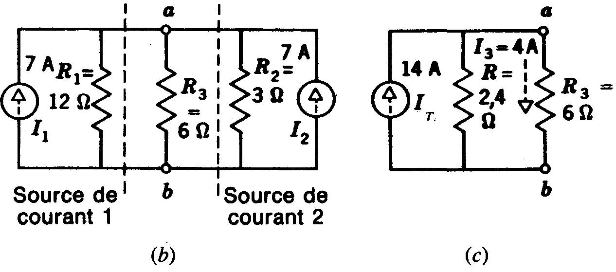 (a) circuit originel; (b) sources I1 et I2 transformées en sources en série V1 et V2;