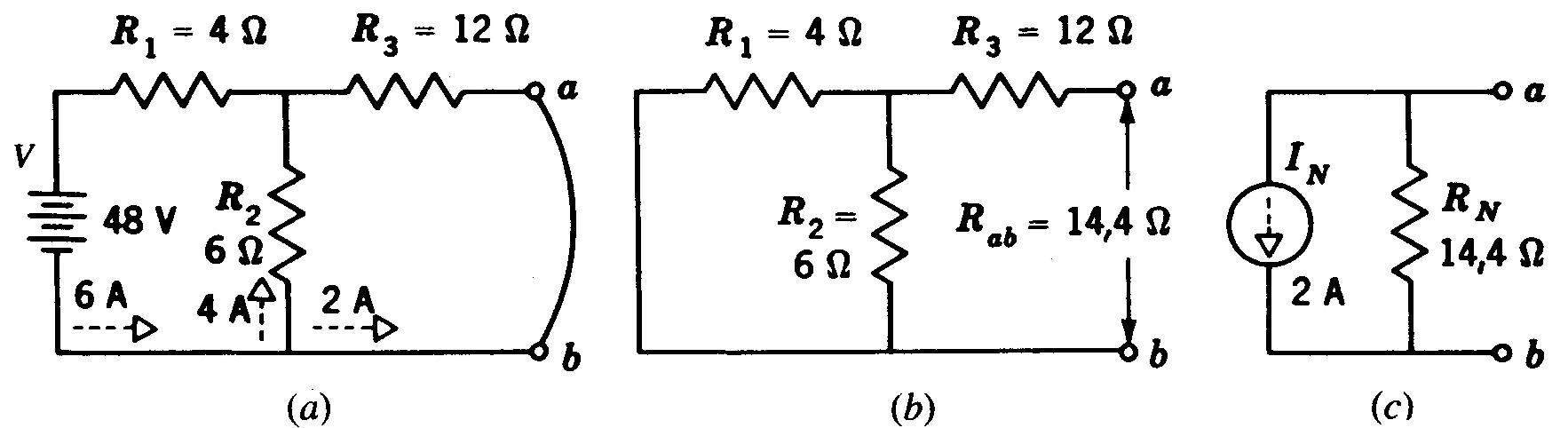 La résistance shunt R de la source de courant combinée de 14A est la résistance résultant de la combinaison des résistances R1 de 12Ω et R2 de 3Ω en parallèle. Cette résistance R est égale à 36/15 soit 2,4Ω, comme on l'a indiqué en (c).