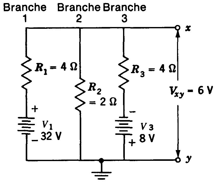 Les extrémités de toutes les branches au point y sont connectées à la masse commune. En outre, les extrémités opposées de toutes les branches sont également reliées au point commun x. La tension Vxy est donc la tension commune aux bornes de toutes les branches.