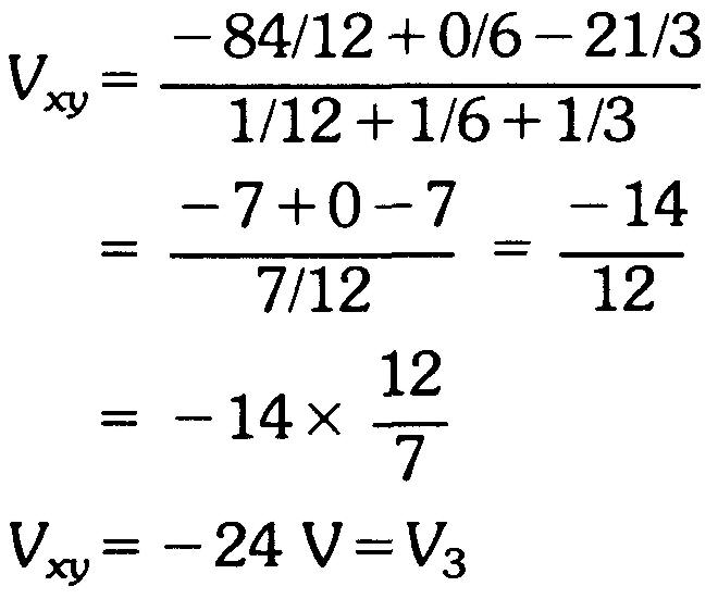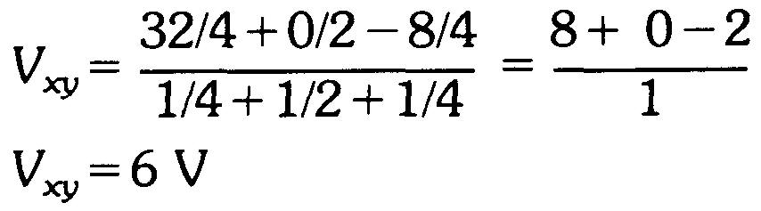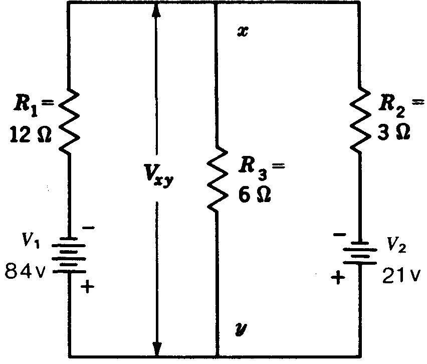 Figure 9-16 Exemple d'application du théorème de Millman pour trouver Vxy, tension commune aux bornes des branches comprenant des sources de tension séparées.