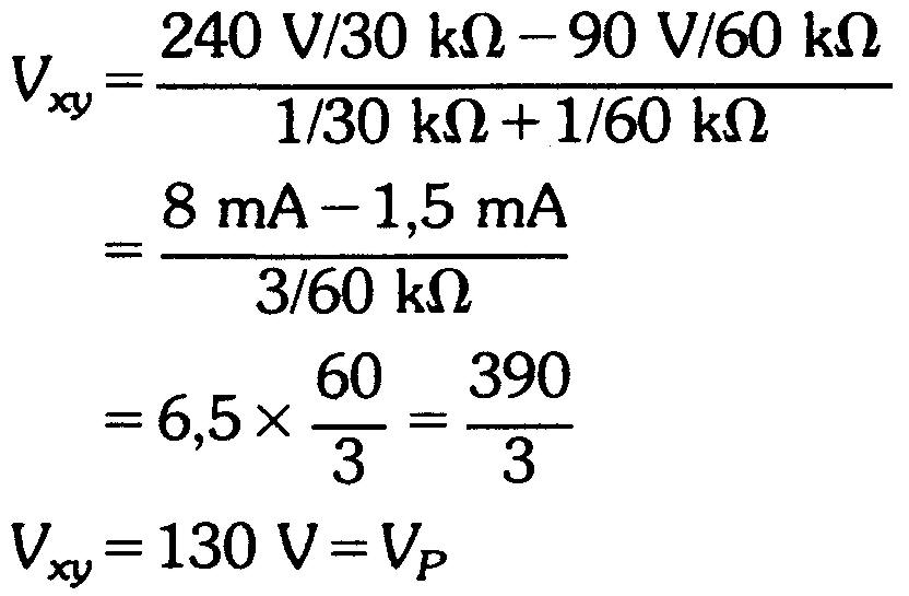 Cette valeur de 130V, obtenue par le théorème de Millman pour la tension entre le point P et la masse, est la même que la valeur calculée précédemment par le théorème de superposition.