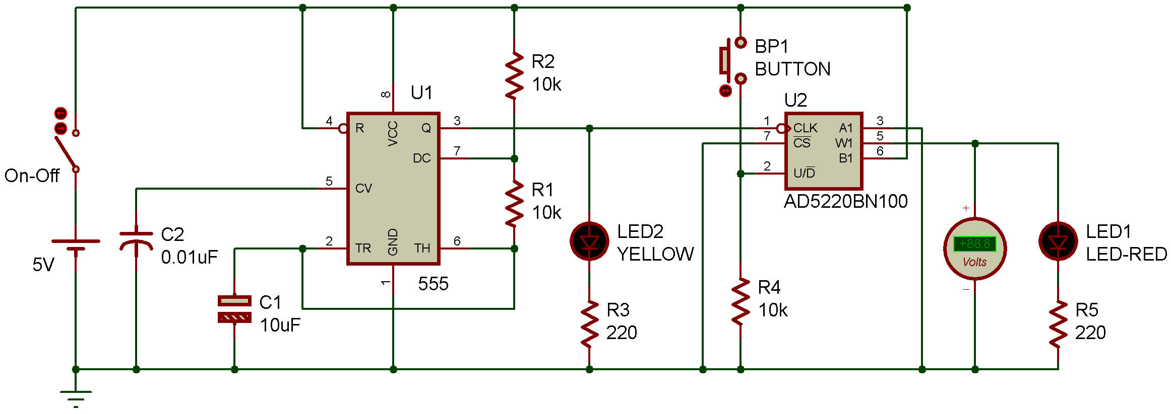 la LED rouge déconnectée. Mettez sous tension et la LED jaune devrait clignoter pour confirmer que la minuterie envoie des impulsions. L'AD5220 démarre toujours avec le Wiper au centre de sa plage, et la tension du Wiper augmentera progressivement, car la broche Haut/Bas (broche 2) est connectée à la masse via une résistance de 10K. Vous verrez votre compteur afficher la tension à mesure que le Wiper gravit les échelons. Maintenant, maintenez le bouton-poussoir enfoncé pour connecter la broche 2 à 5VDC, et la sortie comptera à rebours presque jusqu'à 0V (la valeur réelle dépendra de la résistance interne de votre alimentation). Connectez la LED rouge en parallèle à votre compteur, appuyez sur le bouton pour faire décompter la puce, et la LED s'éteint complètement autour de 1,6 V CC. Cela se produit parce qu’une LED, comme toute diode, nécessite une tension minimale pour fonctionner. J'ai spécifié une LED rouge car elle nécessite moins de tension directe que les autres couleurs. Une LED blanche, par exemple, nécessite au moins 3,2 V CC. Si vous souhaitez que la LED reste faiblement visible à l'extrémité inférieure de la plage, vous devez ajouter une résistance entre la broche 3 du potentiomètre numérique et la masse. Et pendant que vous y êtes, ajoutez un transistor, car nous ne devrions pas vraiment piloter l'AD5220 si près de sa valeur nominale maximale de 20 mA. |