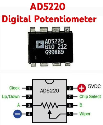 résistance interne totale de 10K, 50K et 100K respectivement). Les impulsions au niveau de la broche Clock déplacent la connexion du Wiper pas à pas, tandis que l'état logique de la broche Haut/Bas détermine si le Wiper avancera vers A ou B. La broche Chip Select doit être mise à la terre pour activer la puce. L'AD5220 nécessite une alimentation 5 V CC, que vous pouvez fournir à l'aide d'un régulateur de tension LM7805 avec une pile 9 V. A et B sont fonctionnellement identiques, vous pouvez donc appliquer une tension dans les deux sens, mais la différence de potentiel ne doit jamais dépasser 5 V. REMARQUE : Vous pouvez également acheter des potentiomètres numériques dans lesquels chaque résistance a une adresse numérique et un code binaire indique au Wiper de passer directement à cette adresse. Toutefois, cela nécessite un protocole de communication série. |