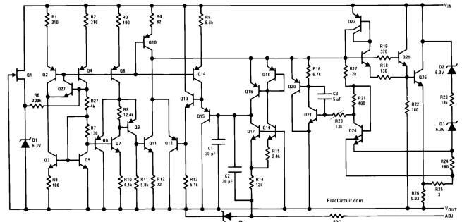 Schéma Schématique Consultez le schéma Schématique à l'intérieur du LM338. Il contient de nombreux transistors, diodes Zener, résistances et condensateurs. |