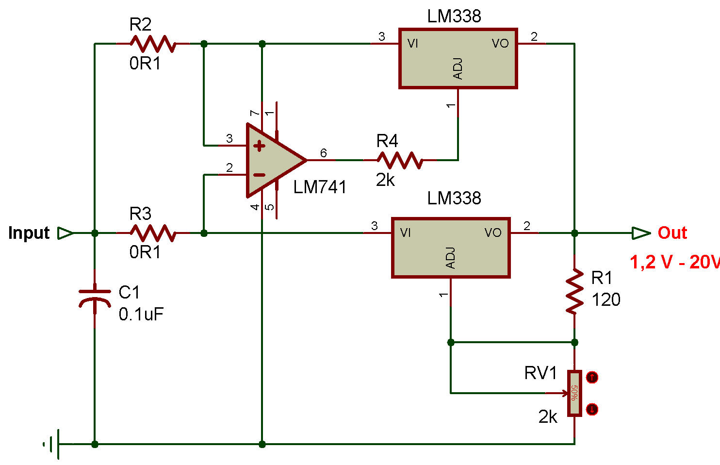 1-20V, 10A Adjustable DC Power Supply If you want Variable Regulated Power Supply with high current of more than 10A up, I would recommend this circuit. Because build easy, use LM338 and LM741. The normal LM338 has a current of about 5A. Then, must use 2 pcs. It causes more current up to 10A. The RV1 adjusts an output voltage of 1.2V to 20V to cover the usual usability. This idea can protect all errors with two LM338. |