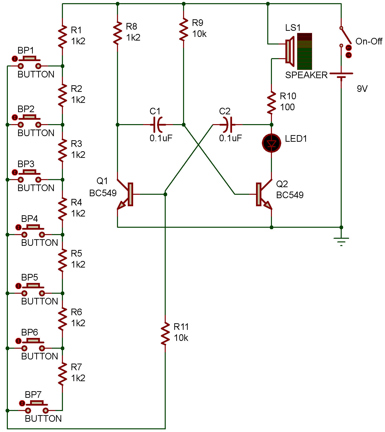 or frequency is based on C1, C2, and R8, R9. In terms of a simple circuit design. We better change R8 and R9. If we leave R8 alone and instead modify R9, it will also change the tone. Which R9 can be controlled by the keypad. We need 7 different tones for 7 different keypads. So, let’s take a look at the simple push-button circuit. These set of resistor and switch represent R9 in the circuit. |