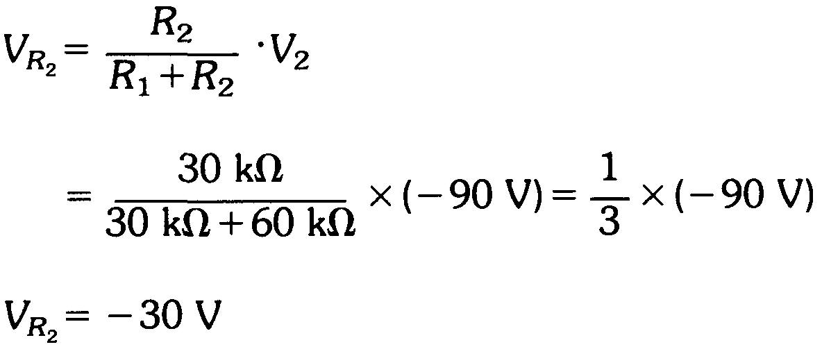 Avec un côté de R2 à la masse et l'autre côté au point P, VR2 est la tension à calculer. Il s'agit encore d'un diviseur de tension mais, dans ce cas, pour la source de tension négative V2.