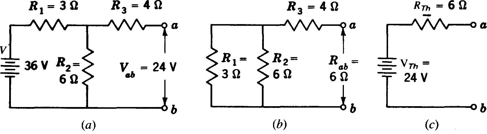 L'équivalent de Thévenin est toujours constitué par une seule source de tension en série avec une seule résistance, comme on l'indique à la figure 9-3d.