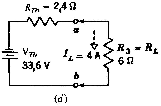 Comme on l'indique à la figure 9-3d, le circuit de Thévenin à gauche des bornes a et b comprend alors la tension équivalente VTh de 24V en série avec la résistance équivalente VTh de 2Ω.