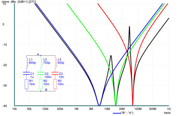 La sélection des types et valeurs de condensateurs est la clé car les différents condensateurs présentent des caractéristiques d'impédance variables entre les fréquences.