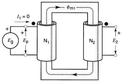 Le nombre de spires au primaire et au secondaire est respectivement N1 et N2 et on suppose que la résistance des enroulements est nulle. Considérons alors un tel transformateur raccordé à une source Eg et fonctionnant à vide (Fig. 30-20).