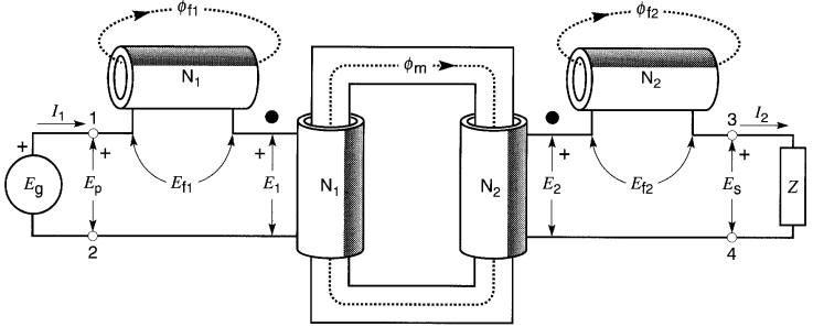 Le flux Φ créé par le primaire peut être subdivisé en deux parties: un flux mutuel Φm1 qui accroche les spires du secondaire, et un flux de fuite Φf1, qui ne les accroche pas.