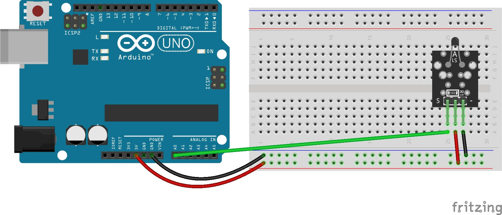 Circuit for a 10K NTC Thermistor Connect module power line V+ (middle) and ground (-) to 5V and GND on the Arduino respectively. Connect the module signal pin (S) to pin A0 on the Arduino. Some KY-013 have a different pin arrangement. Please check your board before connecting. |