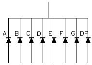 Configuration à anode commune (CA) Affichage à anode commune (AC) – Dans un affichage à anode commune, toutes les connexions anode (A) des segments LED sont reliées à une alimentation positive. L'allumage de chaque segment est obtenu en appliquant un signal de masse (niveau bas) à sa borne de cathode (a à g). Un affichage à anode commune nécessite donc un circuit de commande capable d'absorber le courant. |