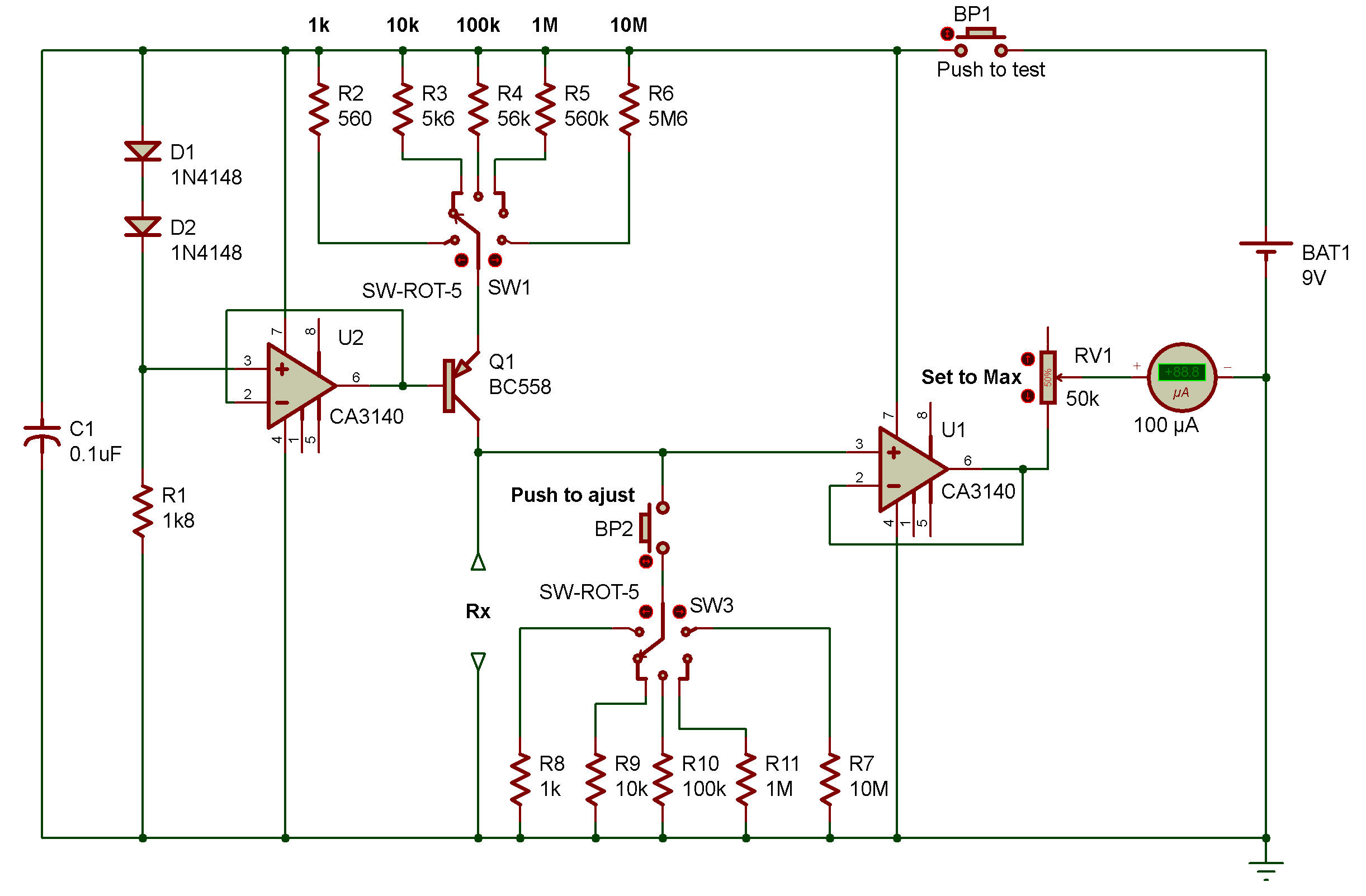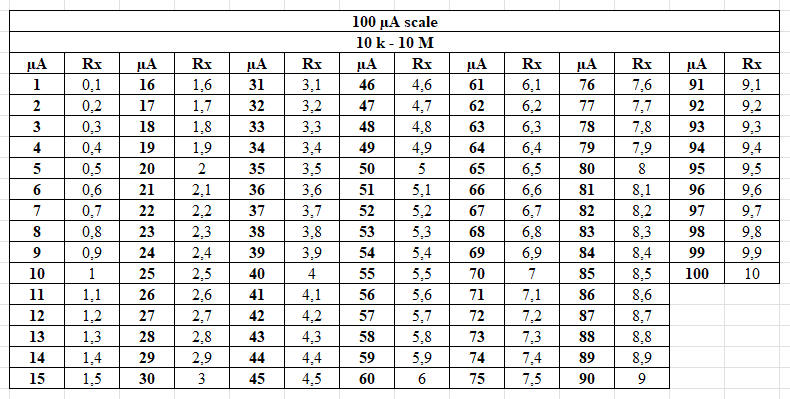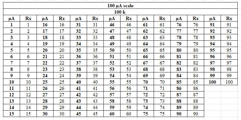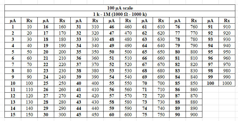 Example for a resistance of 1k, 10K, 100k etc., adjust for a full ammeter reading (100 for 100 µA)