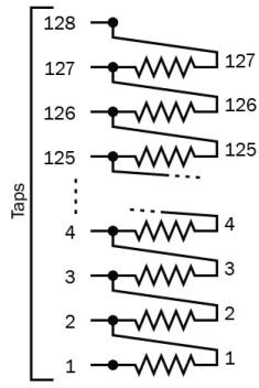 Les connexions entre les résistances sont appelées « prises ». Si vous disposez de 127 résistances (comme dans cet exemple), il y a 128 prises possibles, y compris celles situées aux extrémités de l'échelle. Les potentiomètres numériques comportent généralement 8, 16, 32, 64, 100, 128, 256 ou 1 024 prises. |