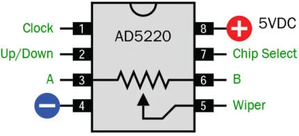 résistance interne totale de 10K, 50K et 100K respectivement). Les impulsions au niveau de la broche Clock déplacent la connexion du Wiper pas à pas, tandis que l'état logique de la broche Haut/Bas détermine si le Wiper avancera vers A ou B. La broche Chip Select doit être mise à la terre pour activer la puce. L'AD5220 nécessite une alimentation 5 V CC, que vous pouvez fournir à l'aide d'un régulateur de tension LM7805 avec une pile 9 V. A et B sont fonctionnellement identiques, vous pouvez donc appliquer une tension dans les deux sens, mais la différence de potentiel ne doit jamais dépasser 5 V. REMARQUE : Vous pouvez également acheter des potentiomètres numériques dans lesquels chaque résistance a une adresse numérique et un code binaire indique au Wiper de passer directement à cette adresse. Toutefois, cela nécessite un protocole de communication série. |