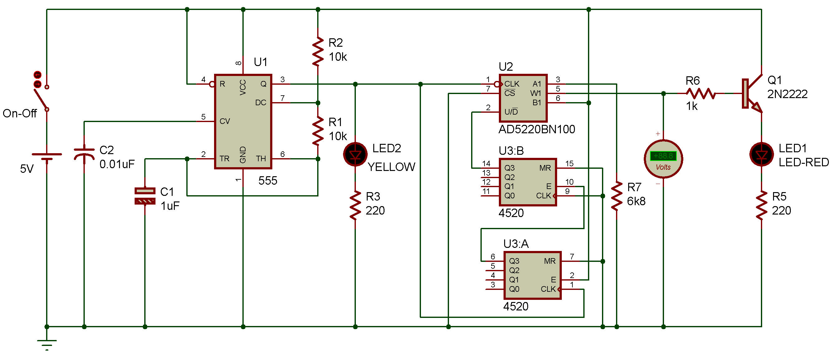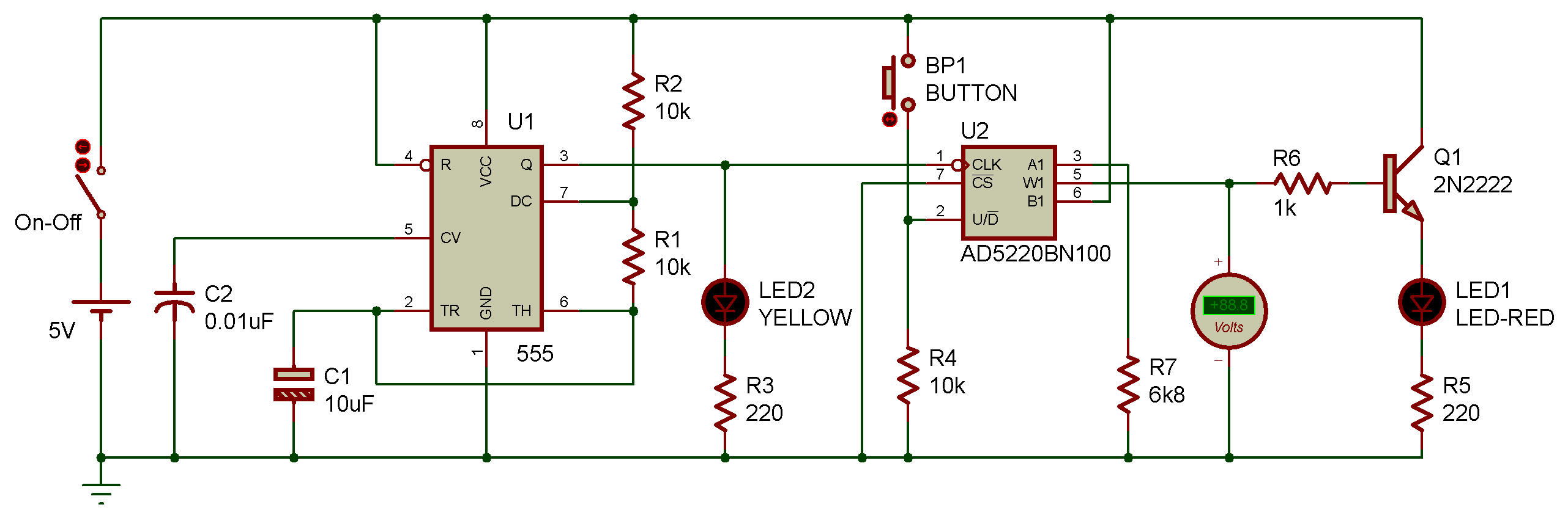la LED rouge déconnectée. Mettez sous tension et la LED jaune devrait clignoter pour confirmer que la minuterie envoie des impulsions. L'AD5220 démarre toujours avec le Wiper au centre de sa plage, et la tension du Wiper augmentera progressivement, car la broche Haut/Bas (broche 2) est connectée à la masse via une résistance de 10K. Vous verrez votre compteur afficher la tension à mesure que le Wiper gravit les échelons. Maintenant, maintenez le bouton-poussoir enfoncé pour connecter la broche 2 à 5VDC, et la sortie comptera à rebours presque jusqu'à 0V (la valeur réelle dépendra de la résistance interne de votre alimentation). Connectez la LED rouge en parallèle à votre compteur, appuyez sur le bouton pour faire décompter la puce, et la LED s'éteint complètement autour de 1,6 V CC. Cela se produit parce qu’une LED, comme toute diode, nécessite une tension minimale pour fonctionner. J'ai spécifié une LED rouge car elle nécessite moins de tension directe que les autres couleurs. Une LED blanche, par exemple, nécessite au moins 3,2 V CC. Si vous souhaitez que la LED reste faiblement visible à l'extrémité inférieure de la plage, vous devez ajouter une résistance entre la broche 3 du potentiomètre numérique et la masse. Et pendant que vous y êtes, ajoutez un transistor, car nous ne devrions pas vraiment piloter l'AD5220 si près de sa valeur nominale maximale de 20 mA. |