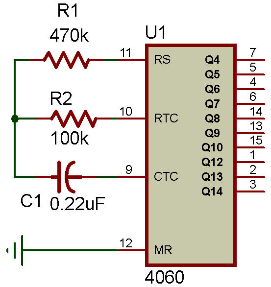 How To Use The CD4060 First of all, you need to connect the VDD (VSS) pin (16) to your positive supply terminal and the GND pin (8) and Reset (12)to your negative supply terminal. You can use a power supply voltage between 3V and 15V. Although, some versions of the 4060 chip support up to 20V. Check your datasheet for exact values. To activate the oscillator, connect a resistor from the R pin (10), a capacitor from the C pin (9), and a resistor from the CLK pin (11), and connect all three of them at the other end: |