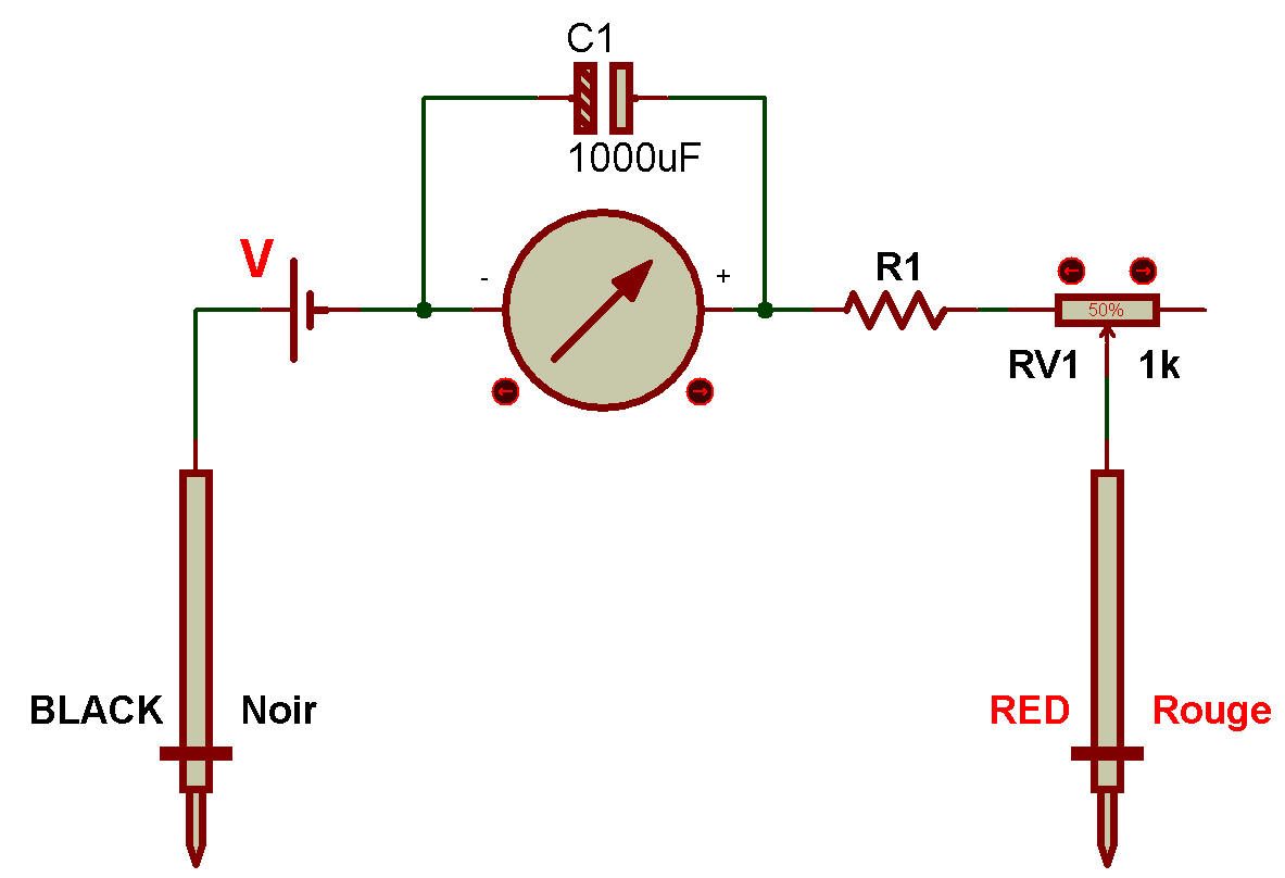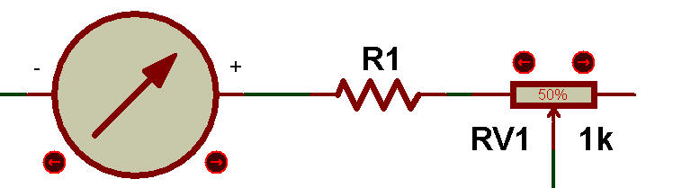 De plus, cette condition limite l'utilité de l'appareil. Si la limite gauche de l'échelle sur le cadran représente une résistance infinie, la limite droite devrait représenter zéro. Actuellement, notre conception bloque l'aiguille de l'appareil à droite lorsqu'une résistance nulle est connectée entre les cordons de test. Nous devons trouver un moyen de faire en sorte que l'aiguille indique la pleine échelle lorsque les cordons de test sont court-circuités. Ceci est réalisé en ajoutant une résistance en série au circuit de l'appareil : |