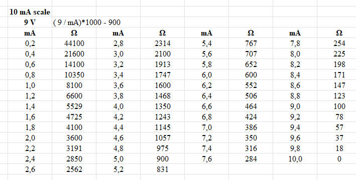 Example for a 1 mA ammeter and a 9V battery. |