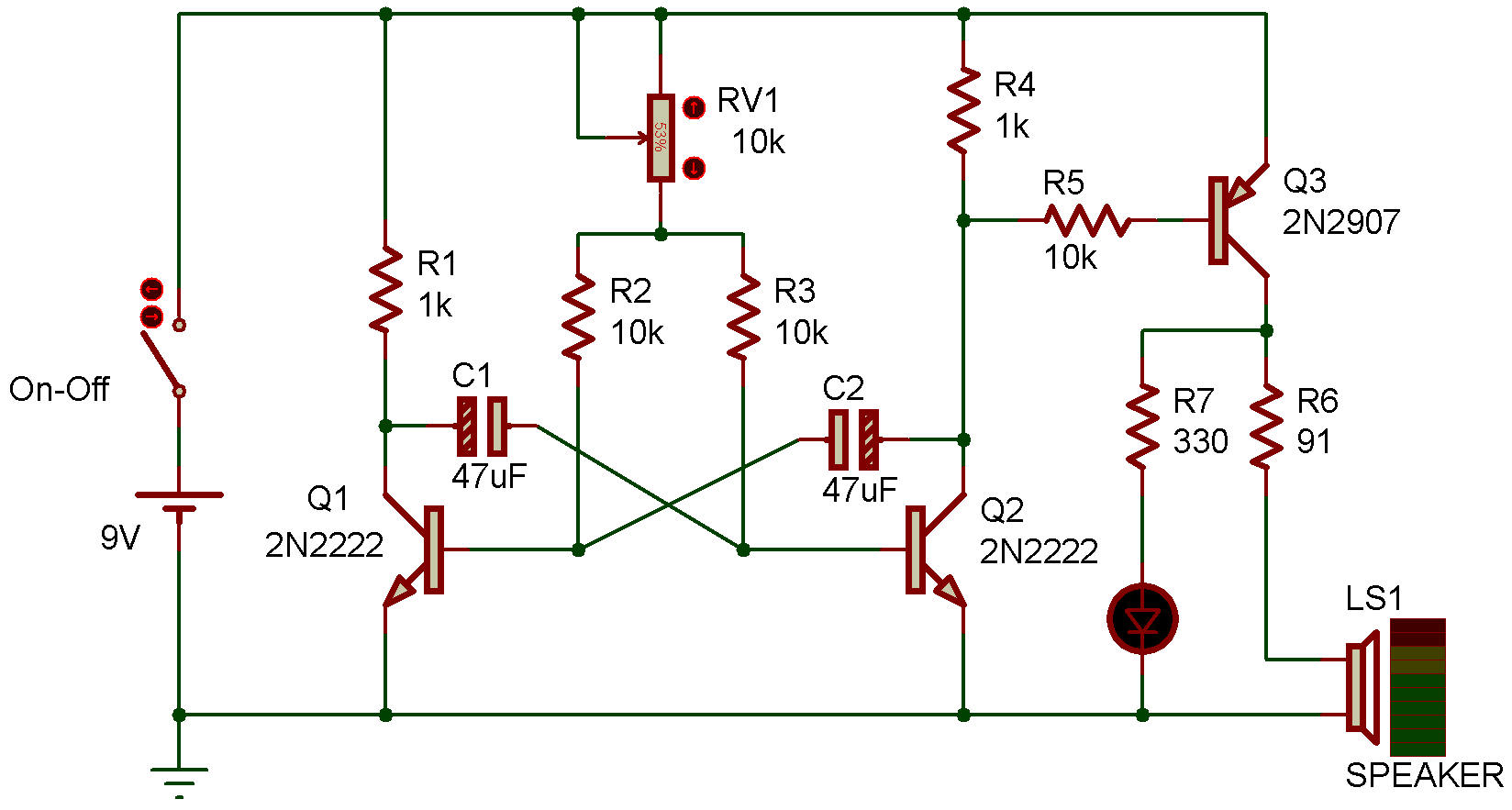 Working The operating voltage of this circuit is 9 to 12 V, it produces beats that are adjustable to your liking. The potentiometer (variable resistor) VR1 increases or decreases the speed of the beats. The lower the resistance set on the potentiometer the faster the metronome will tick. You can also vary the values of R2, R4, or C1, and C2 for variation in speed but make sure both pairs of resistors and capacitors have the same value. For example, if you’re using 15K R2, then R3 should be 15K as well and the same goes for capacitors. A combination of three transistors is used, two of which are NPN and one is PNP. They are used to amplify the electronic signals. An 8Ω speaker is connected at the output which produces the toc-toc beats. Applications and Uses Learning to play beats and tempos continuously. Used by recording musicians to click tracks in order to help audio engineers with synchronization. Composers use them to derive beats per minute. Apart from them, they also serve in different tests of the psychological laboratory to maintain the desired cadence. |