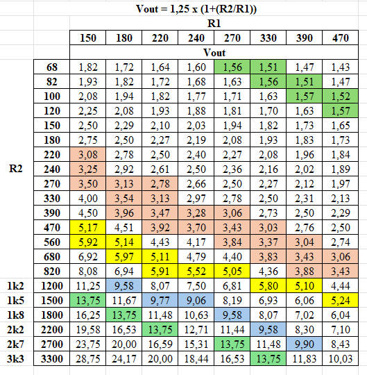 Utilisation du tableau des résistances (sans calcul) Si vous n'avez pas de calculatrice ou si, comme moi, vous avez un peu de mal à calculer, utiliser le tableau des résistances est une solution simple. Il suffit de choisir les résistances appropriées en fonction de la tension. Par exemple, vous avez besoin d'une alimentation de 20 V et 5 A. Vous regardez à 20,00 V : R1 = 180 Ω, R2 = 2,7 kΩ ou R1 = 220 Ω, R2 = 3,3 kΩ |
