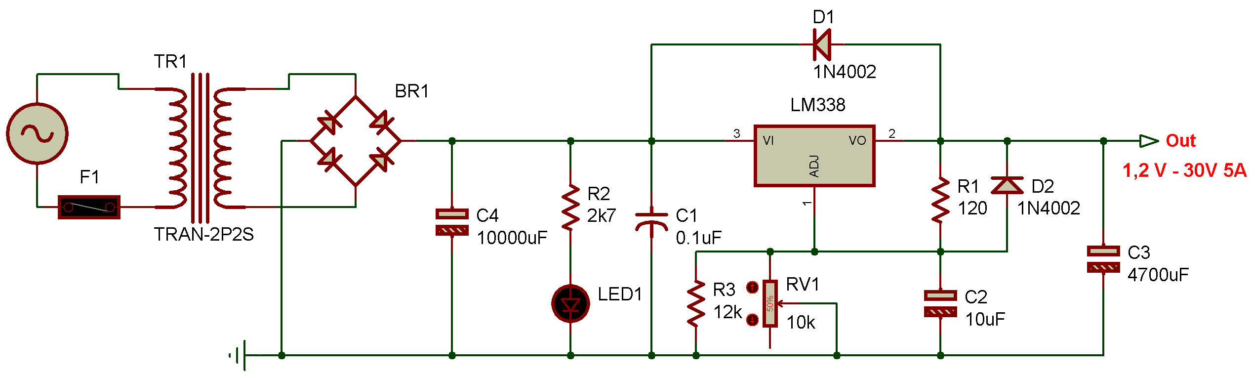 LM338 features 7A Maximum output current 5A output current Adjustable output 1.2V to 37V (Variable Power supply circuit) Line regulation typically 0.005% /V Line regulation typically 0.1% Thermal regulation Current limit constant with temperature |