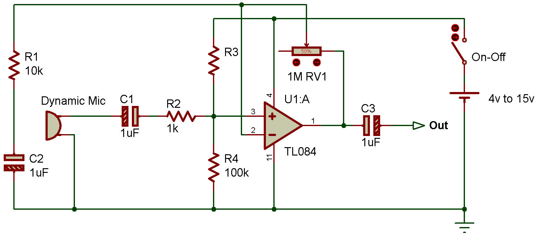 works Here is a NON-Inverting Amplifier. It’s more convenient when to use a single power supply, 4V to 15V. Because both resistors R3, R4 connect together in voltage divider form. R3 = 100k And Capacitors coupling an audio signal. The microphone gets any sounds to convert to an audio signal. C1 passes that signal through R2 to non-inverting input pin 3. We use R1 and RV1 to control the gain of this circuit. Gain = 1+ (VR1/R1). So, we can control the gain by RV1. We can use low or medium impedance Dynamic Microphone to this circuit. |