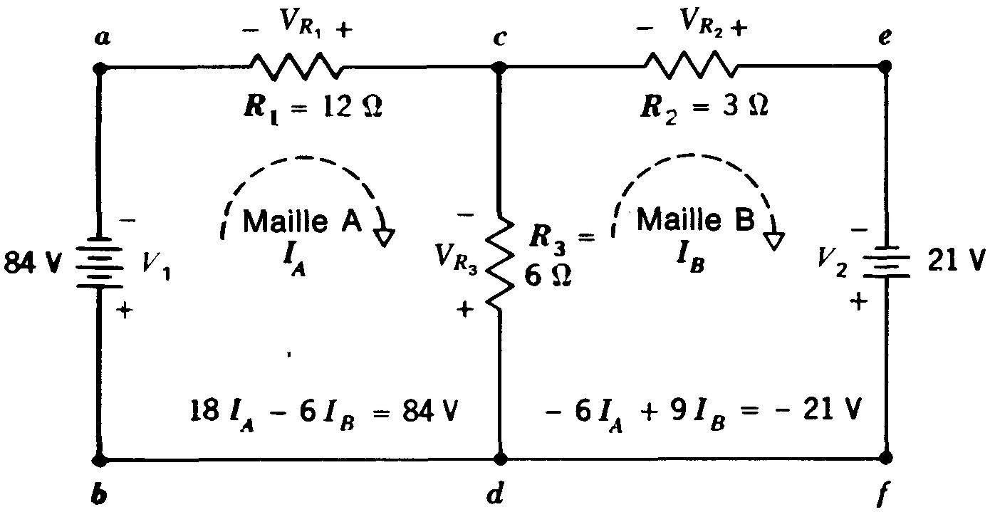 Dans la figure 8-6, le courant de maille IA traverse V1, R1 et R3; le courant de maille IB traverse V2, R2 et R3. Une résistance commune à deux mailles comme R3 est traversée par deux courants de mailles qui seront dans ce cas IA et IB.