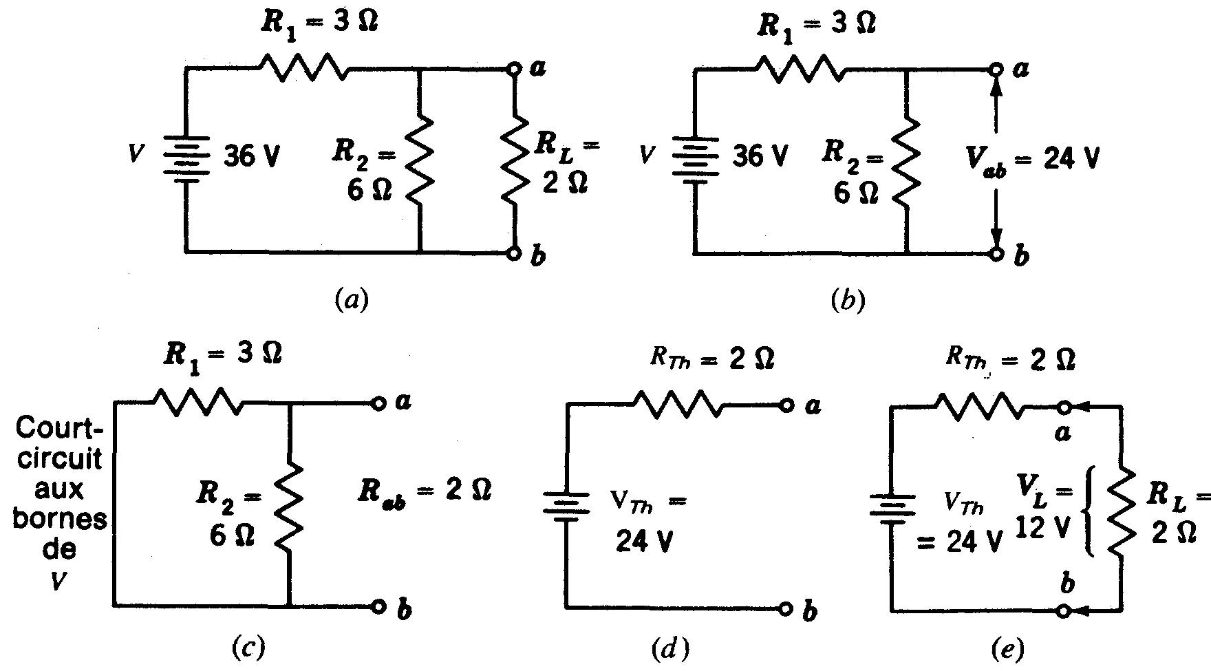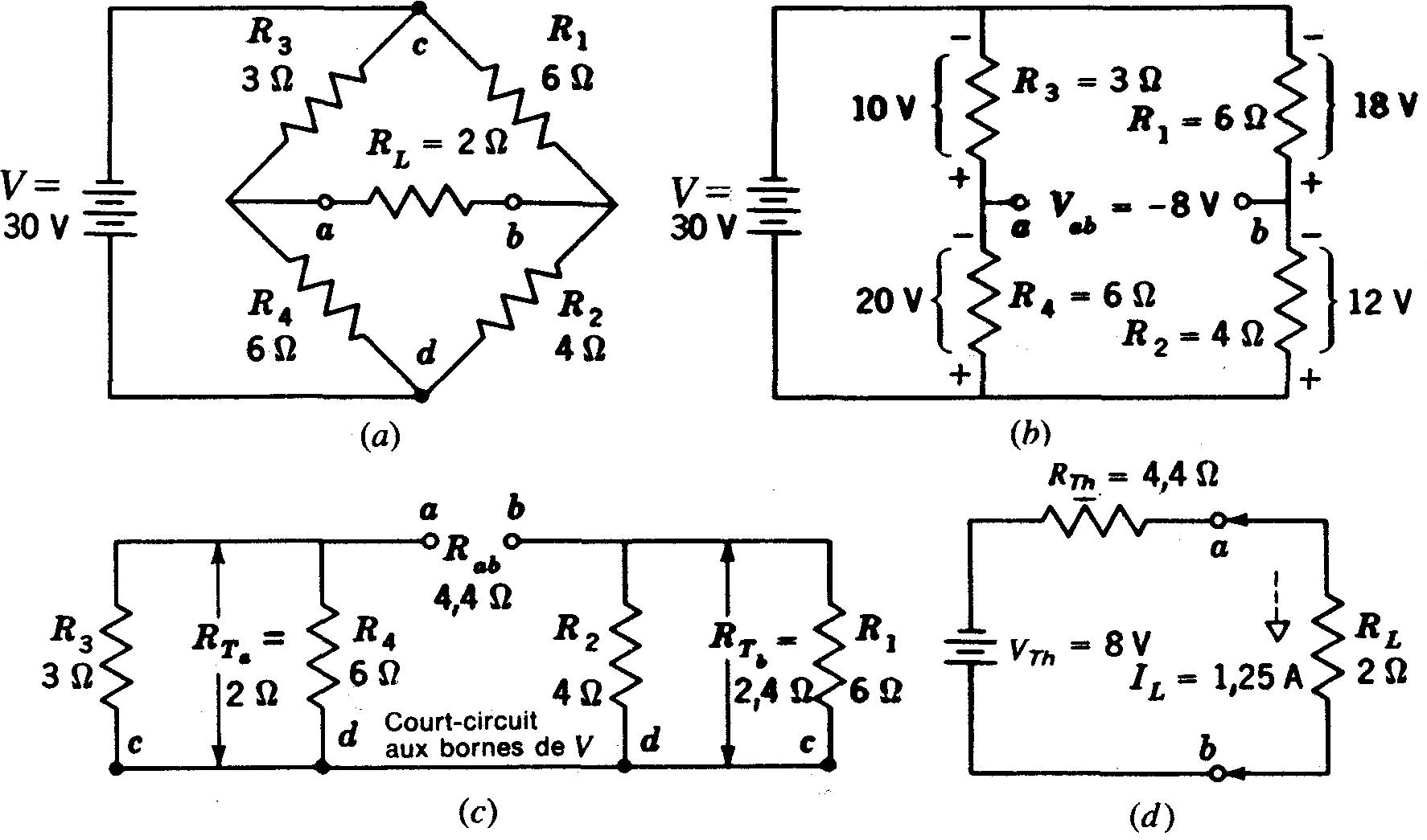 (d) circuit équivalent de Thévenin dans lequel RL est rebranchée entre a et b.