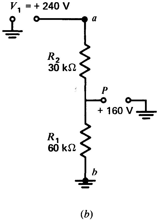 On peut, de même, trouver le potentiel au point b à partir du diviseur de tension R1R2. La tension Vab est alors la différence entre les potentiels des points a et b.