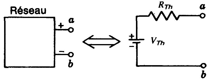 Figure 9-2 Tout réseau du carré de gauche peut être ramené au circuit de Thévenin équivalent de droite.