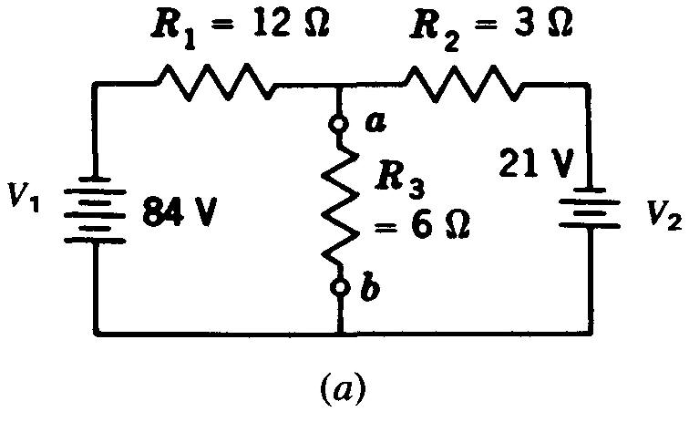 Comme on l'indique à la figure 9-3d, le circuit de Thévenin à gauche des bornes a et b comprend alors la tension équivalente VTh de 24V en série avec la résistance équivalente VTh de 2Ω.