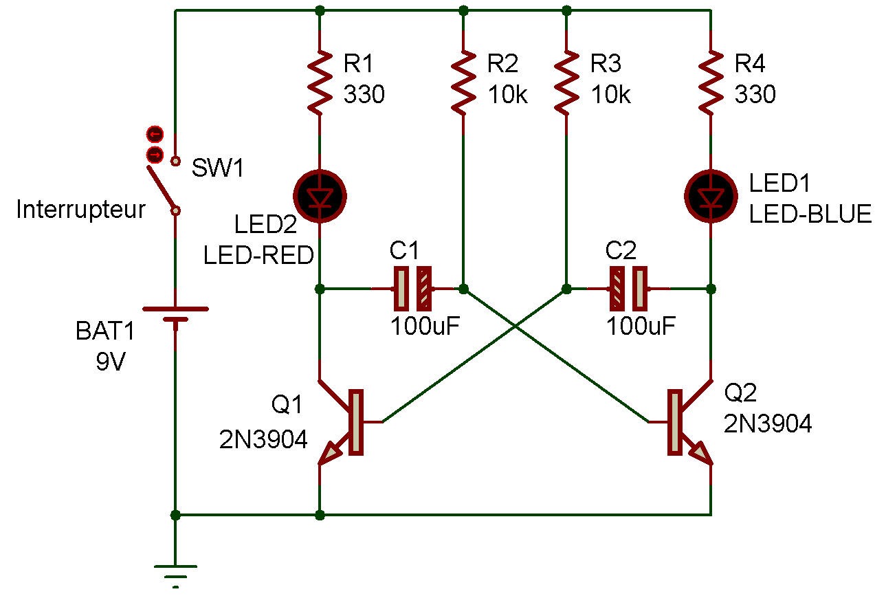 La fréquence de clignotement des LEDs peut être augmentée ou diminuée en modifiant les valeurs des résistances R2, R3 et des condensateurs C1, C2.