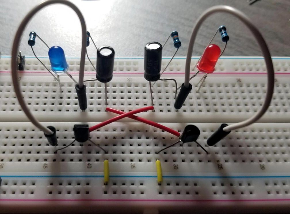 Il a deux transistors, deux condensateurs et quatre résistances pour accomplir un marche-arrêt à vitesse variable des LEDs.