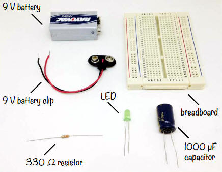 Il s'agit quasiment du même circuit que celui que vous avez construit dans le « Projet n° 9 : Votre premier circuit de platine d'expérimentation » section Créer de la lumière avec des leds, mais cette fois, vous allez ajouter un condensateur.