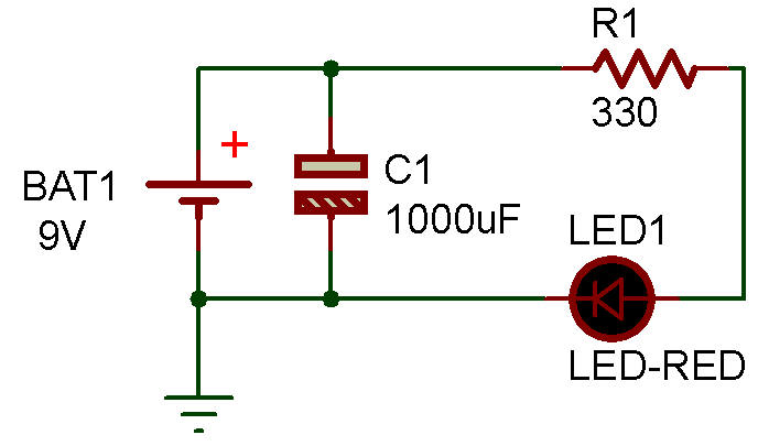 Lorsque vous retirez la pile du circuit, comme illustré ici, vous constaterez que la LED reste allumée pendant une ou deux secondes. Cela est dû au fait que le condensateur alimente la LED grâce à l'énergie stockée.