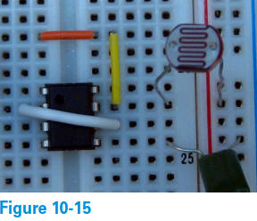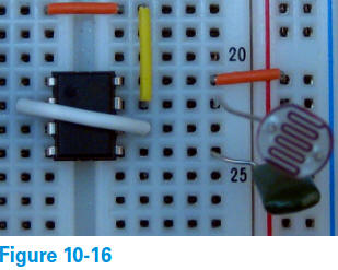 Au lieu d'utiliser deux résistances et un condensateur pour réguler la tension de sortie de la puce 555, comme dans le projet 9, vous utilisez une seule résistance, une photorésistance et un condensateur.