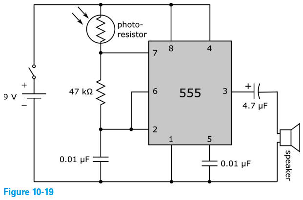 De même, là où le projet 8 utilise deux résistances et un condensateur pour contrôler la durée de l’alternance de tension sur la broche 3, ce circuit utilise une résistance, une photorésistance et un condensateur pour contrôler cette durée.