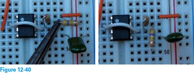 La résistance de 470 kΩ, la résistance de 47 kΩ et le condensateur de 0,1 μF, situés à gauche de la minuterie 555, contrôlent la temporisation de la tension de sortie sur la broche 3.