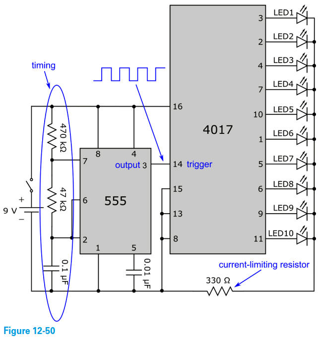 déclencher le compteur décimal 4017 ; la broche 3 de la minuterie 555 est donc