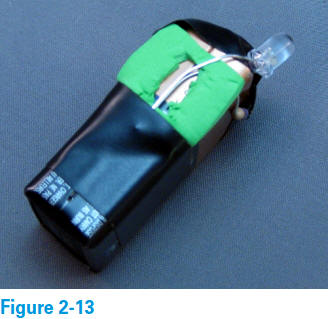 7. Collez le fil le plus long (anode) de la LED sur le côté de la batterie. (Voir Figure 2-13.)