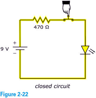 Le schéma de la figure 2-22 représente votre circuit lorsque vous appuyez sur la découpe en mousse, ce qui met en contact les fils de la LED et de la résistance.