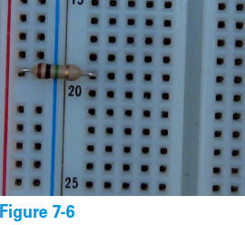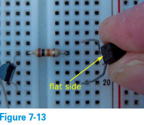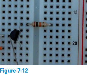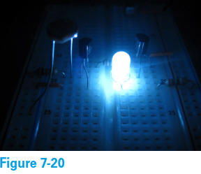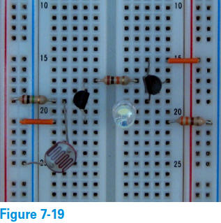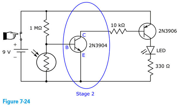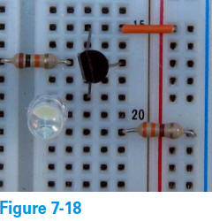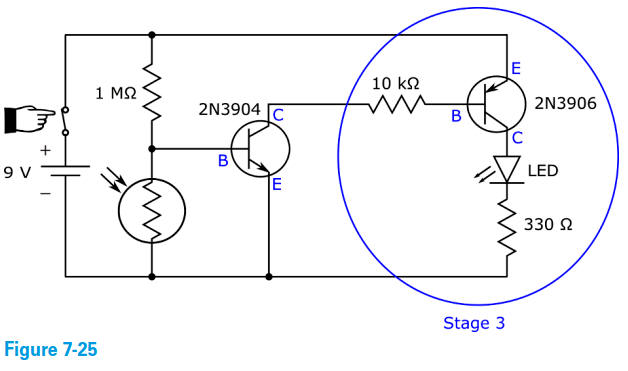 La troisième étape (entourée sur la figure 7-25) du circuit comprend un deuxième transistor, une résistance de limitation de courant de 10 kΩ à la base du transistor, une LED et une résistance de protection de 330 Ω pour la LED.