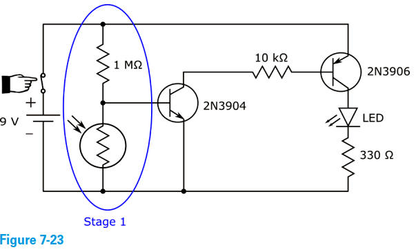 La figure 7-27 montre que, dans l'obscurité, la résistance de la photorésistance est élevée, ce qui augmente la tension à la base du premier transistor et l'active.