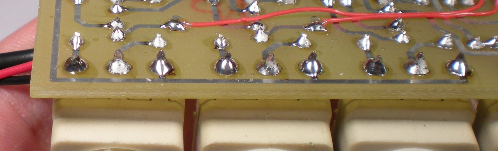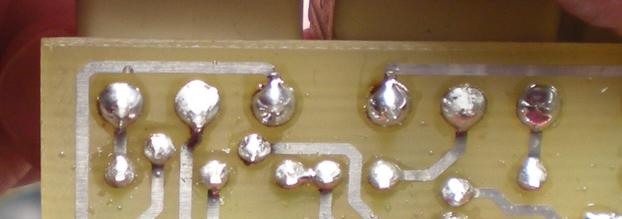 Si le circuit imprimé a été étamé juste après sa réalisation, pas besoin de le préparer davantage. Si en revanche il ne l'a pas été, vous devrez le nettoyer à l'aide d'une gomme abrasive spécialement conçue pour cet usage, avant de souder quoi que ce soit. Un circuit imprimé en cuivre nu s'oxyde en effet très rapidement, et l'oxyde qui se forme empêche de façon certaine de faire de bonnes soudures. Je ne sais pas si la photo ci-dessous montrera bien sur votre écran ce qu'elle doit montrer, mais je l'espère. On y voit en effet un circuit imprimé non étamé qui s'est oxydé, dont la moitié a été nettoyée (avec une gomme abrasive), et l'autre moitié non. Je vous déconseille d'utiliser le côté rugueux d'une éponge de cuisine classique, ça fonctionne très très mal, ça fait plein de poussière verte et c'est très long, on se fatigue vraiment beaucoup le poignet pour pas grand chose. Évitez aussi l'usage de tampon jex (éponge en laine de fer), qui bien que plus efficace (et encore) peu laisser des résidus conducteurs pouvant provoquer des micro-court-circuits.